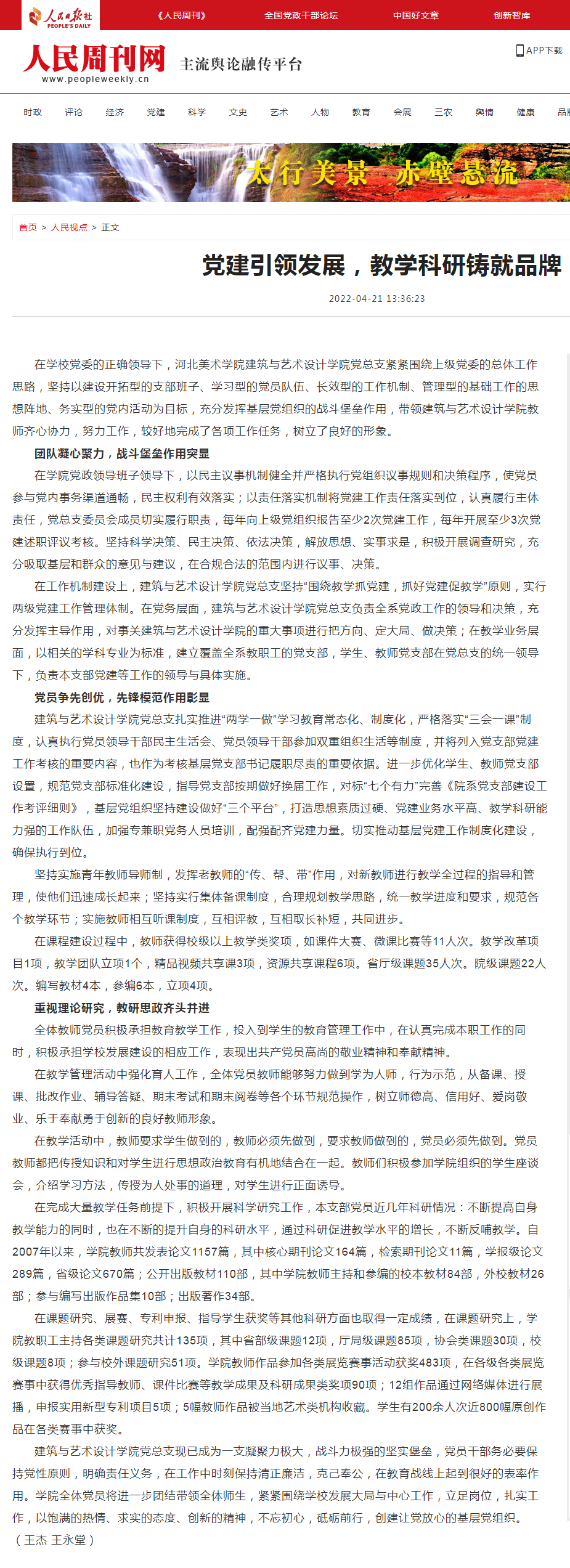 4月19日,人民日报河北站记者专访BEAT365建筑与艺术设计学院党总支书记王杰、第二支部书记王永堂,并在人民周刊网刊文《党建引领发展,教学科研铸就品牌》,介绍了建筑与艺术设计学院的党建工作,重点突出了党建活动的品...