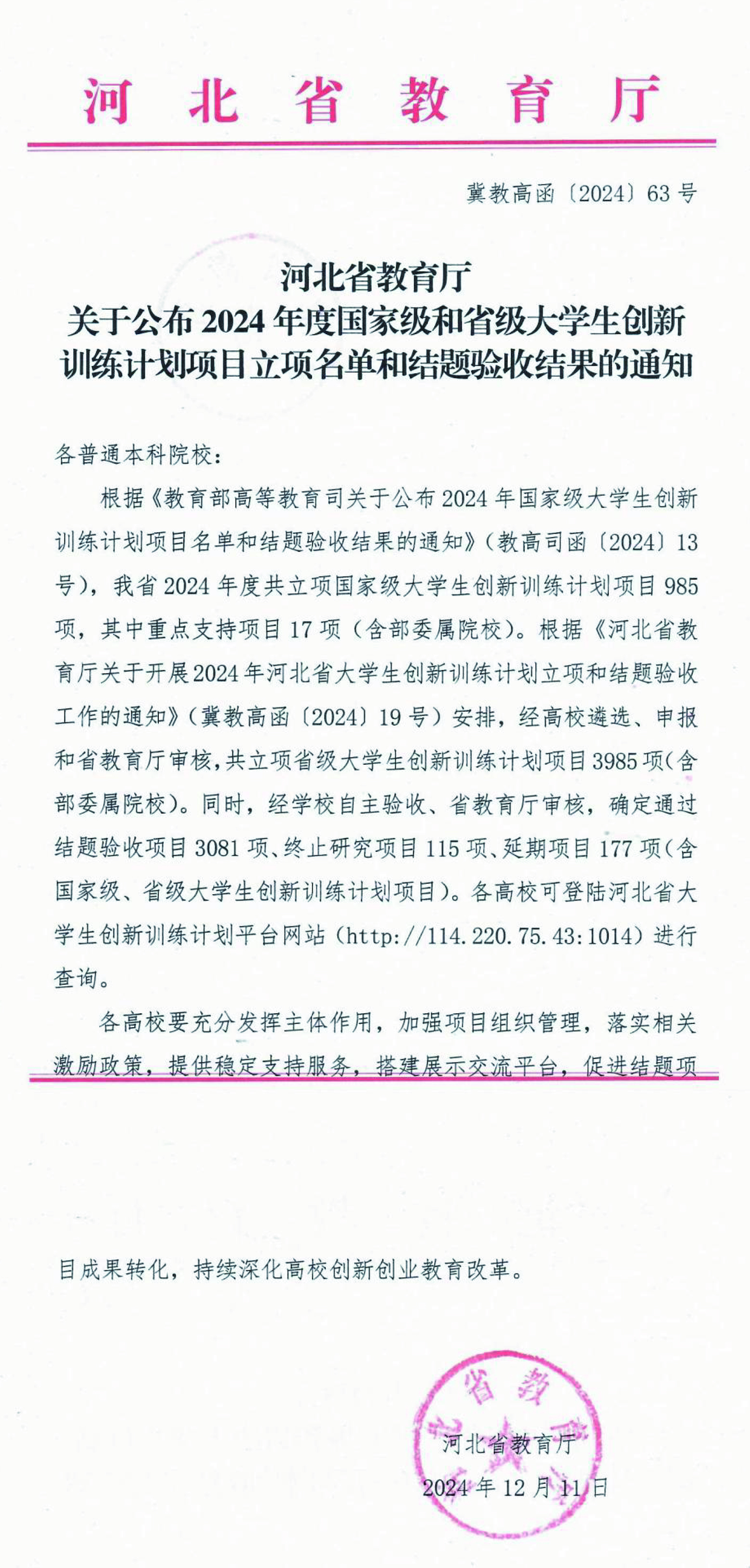 近日,河北省教育厅公布了“2024年度国家级和省级大学生创新创业训练计划项目立项名单和结题验收结果”。经学校遴选、验收、申报和省教育厅审核,BEAT3652023年度大学生创新创业训练计划15个省级立项项目均顺利通过结题验收,2024年度大学生创新创业训练计划项目省级立项20项。大学生创新创业训练计划是教育部“高等学校本科教学质量与教学改革工程”重点建设项目之一。通过实施大学生创...