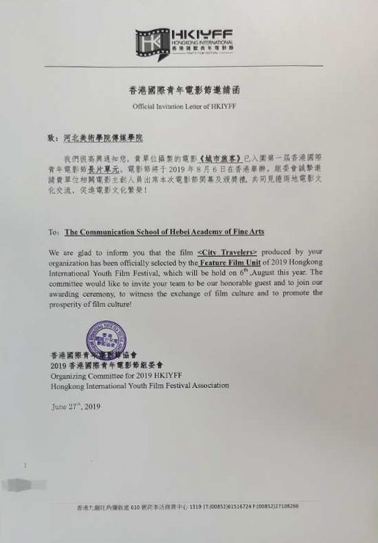 第一届香港国际青年电影节将于2019年8月6日在香港举办,由BEAT365传媒学院摄制的电影《城市旅客》确定入围并受邀参加颁奖典礼。本片由传媒学院院长王峰担任总制片人,特聘教授牛中明担任导演,外聘教授杨风山、关宏宇担...