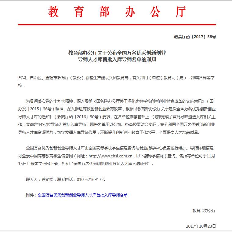 为深入贯彻《国务院办公厅关于深化高等学校创新创业教育改革的实施意见》精神,推进高校创新创业教育改革,根据《教育部办公厅关于建设全国万名优秀创新创业导师人才库的通知》要求,教育部在各单位推荐基础上,完成了首批导师遴选入库相关工作,共确定4492位导师为首批入库导师。