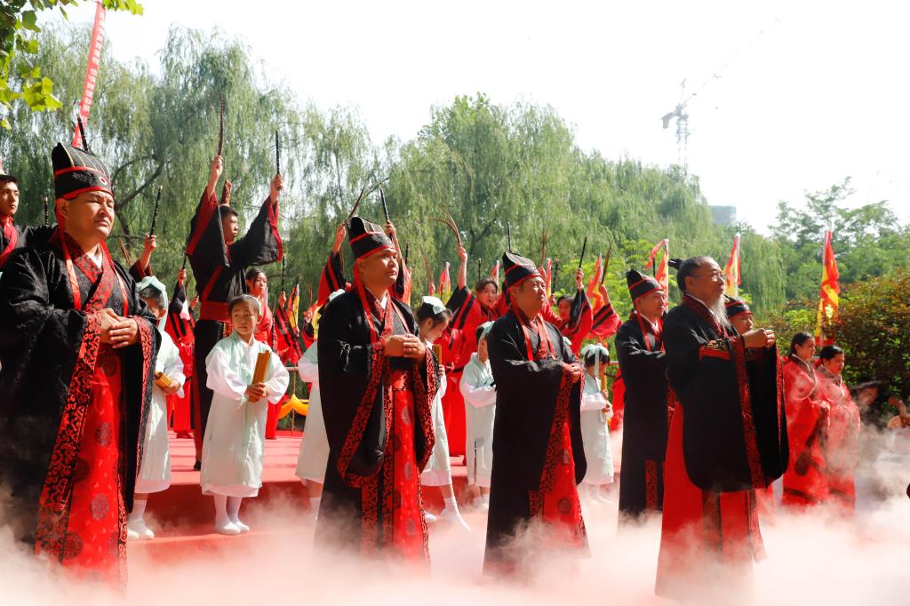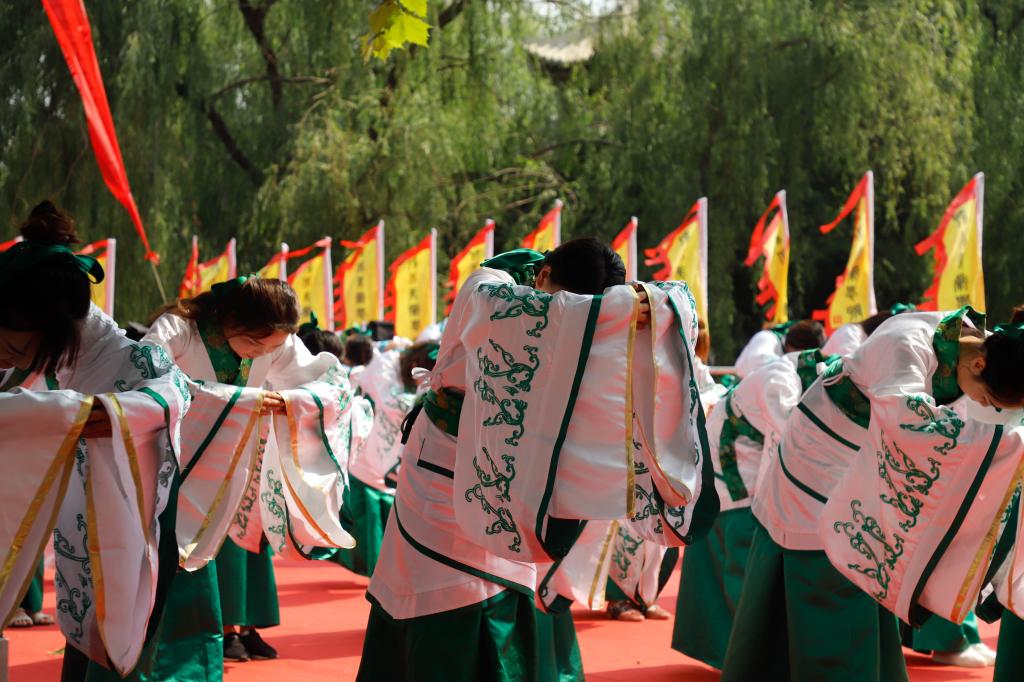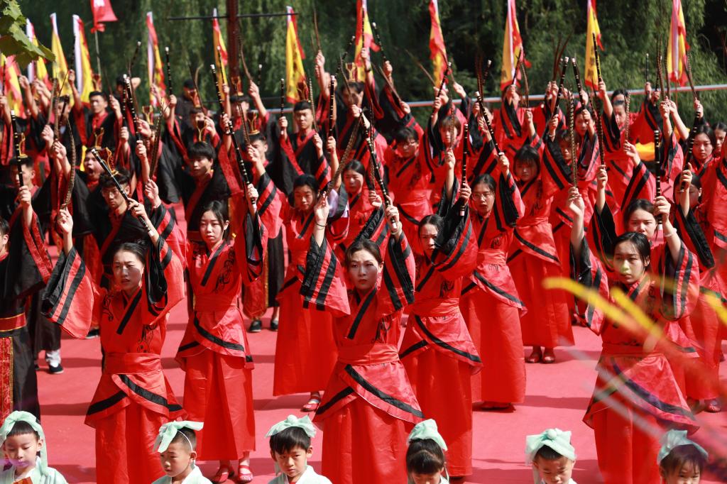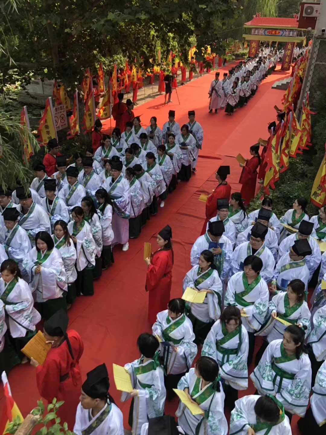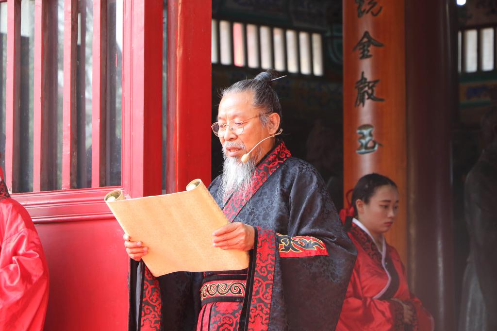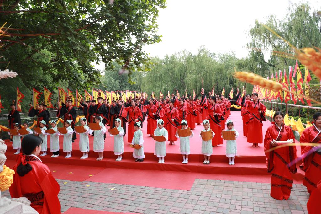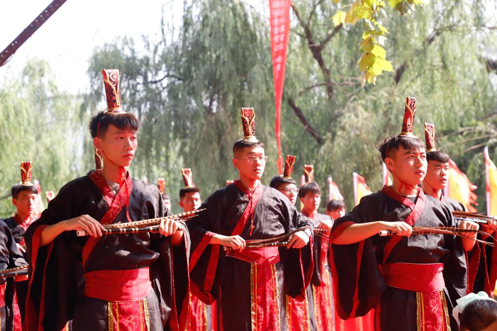 学校大成殿红绸装点,彩旗飘扬,古风汉韵,焕然一新。师生着汉服,肃立大成殿前,恭祭吾华夏圣师。古乐团的编磬、编钟、古筝奏响悠扬的祭祀雅乐。64位八佾舞者身着鲜红色古制式礼服,手执雉翟,踏乐起舞,动作庄严齐一。
