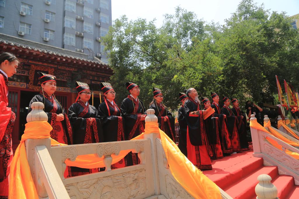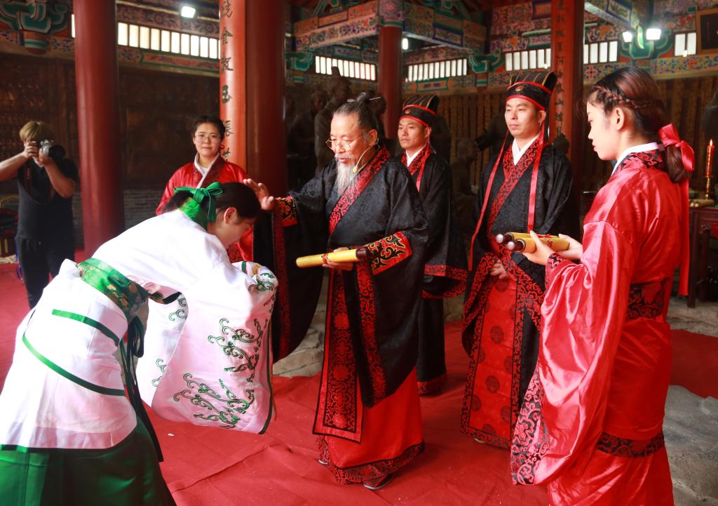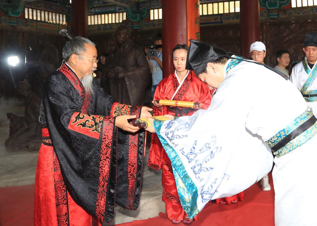 毕业生依次受导师“扫浮尘”“荷花净水”礼入殿,领取学位证书。大殿中央,甄忠义校长面带微笑,轻抚学生头顶为其“灌顶”,颁发学位证书,祝贺吾弟子今出师,叮嘱他们勇于担当,勿忘母校所托和国家所望。