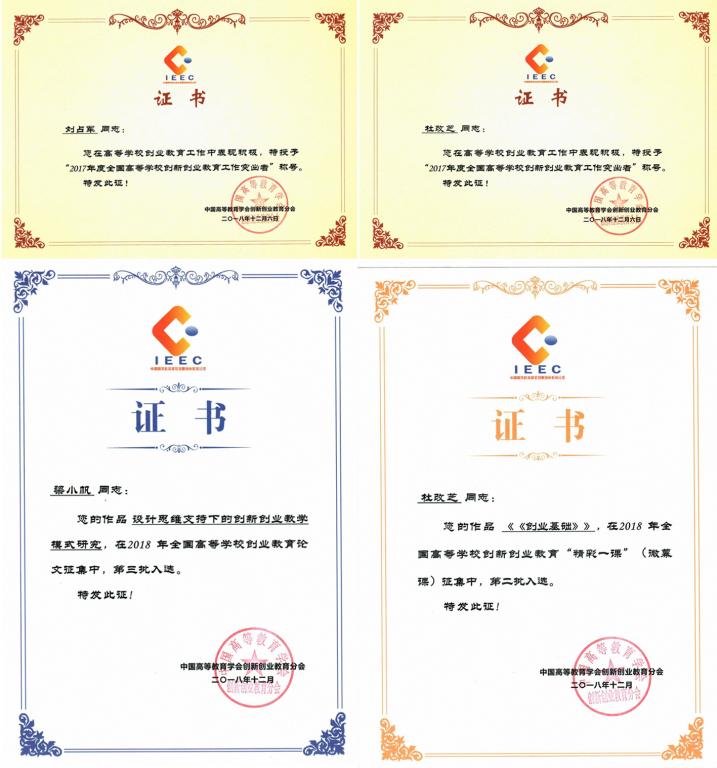 BEAT365荣获“全国深化创新创业教育改革特色典型经验高校”称号,学校刘占军、杜改芝老师获得“全国高等学校创新创业教育工作突出者”称号;杜改芝老师的《创业基础》(微慕课)在2018年全国高等学校创新创业教育“精彩一课”第二批入选;梁小帆老师撰写的论文《设计思维下的创新创业教学模式研究》第三批入选。