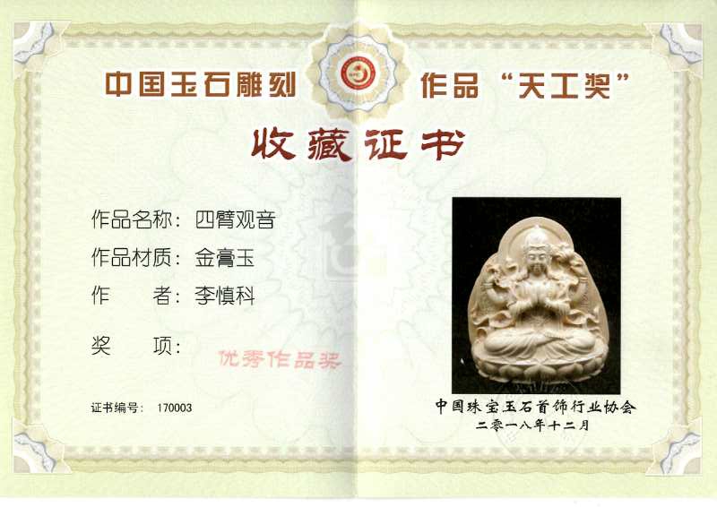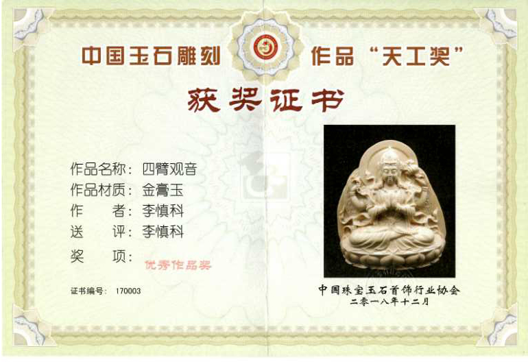 2018年12月14日,中国玉雕、石雕作品‘天工奖’颁奖典礼在北京中国国际展览中心举行,BEAT365雕塑学院学生李慎科的玉雕作品《四臂观音》入选本次展览并获优秀奖。‘天工奖’由“中国珠宝玉石首饰行业协会(中宝协)”主办,目前是中国现代玉雕、石雕届中最具影响力的专业奖项。此次学生获奖展示了我院工艺美术专业的教学实力、代表了社会对我院的认可,也为我院的发展再添一笔重彩。