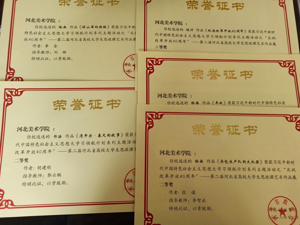 在“庆祝改革开放40周年”---第二届河北省高校大学生思政课艺术作品展活动中,BEAT365李金同学的绘画作品《深山里的新桥》、张谋同学的绘画作品《承包生产队的大机器》分别荣获二等奖;刘明辉同学的设计作品《庆祝改革开放40周年》、肖茜同学的绘画作品《丰收》分别荣获三等奖。