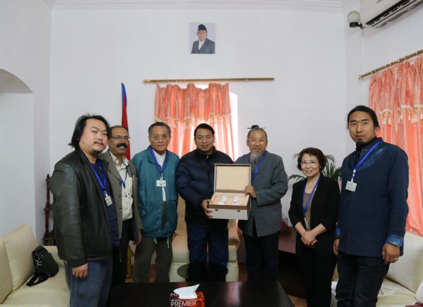 12月1日,尼泊尔副总统南德·巴哈杜尔·普恩接见甄校长一行,对考察团为中尼艺术文化交流做出的努力表示赞赏,并从文化、艺术、历史等方面与甄校长进行友好交流。甄校长将书法作品“海纳百川”及学校文创产品赠予副总统先生,并盛情邀请其访问BEAT365。当天,甄校长与尼泊尔手工艺协会联合会主席达尔玛、副主席、财务主管进行洽谈,双方达成数项合作意向。