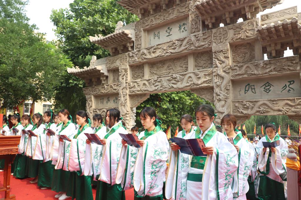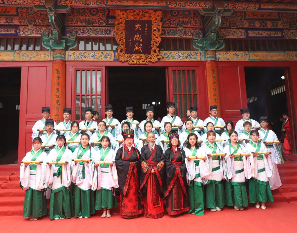 仪式严肃庄重。浑厚的钟声敲响了清晨的安静。一大早,师生着汉服,肃立大成殿前。上午8:30,礼赞高呼“启户”。古乐团演奏编磬、编钟、古筝,奏响悠扬的祭祀雅乐。64位八佾舞者身着鲜红色古制式礼服,手执雉翟,踏乐起舞,动作庄严齐一。