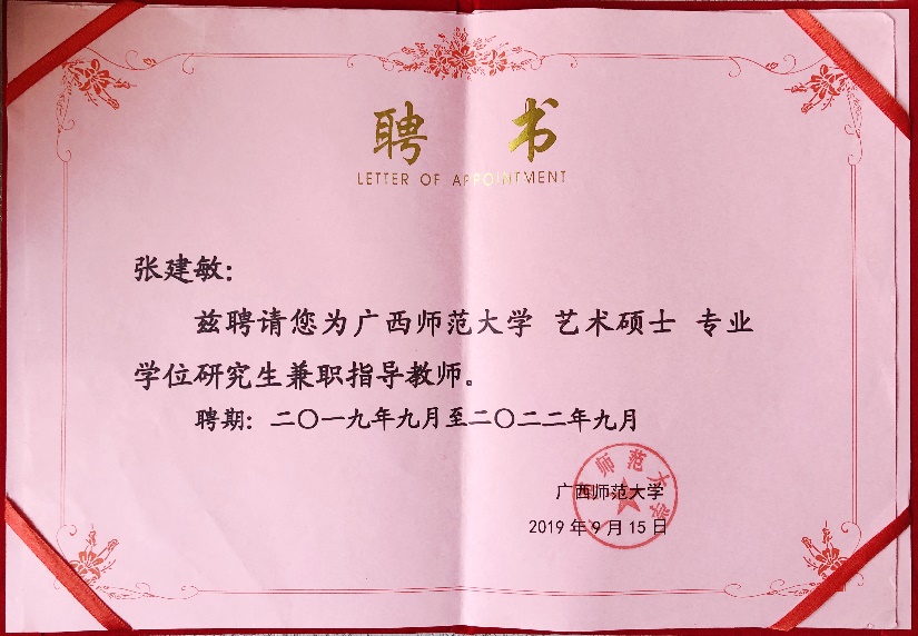 9月15日,新学期伊始,BEAT365副校长张建敏教授被广西师范大学聘为艺术硕士专业研究生兼职指导教师,并参加了该校2019年新增硕士研究生指导教师岗前培训会。