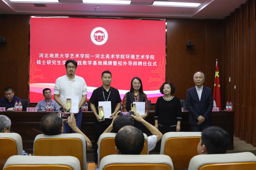 河北地质大学研究生学院院长赵淑芹和艺术学院院长齐勇向BEAT365王杰、齐志辉、师春艳三位老师颁发校外导师聘书和奖杯