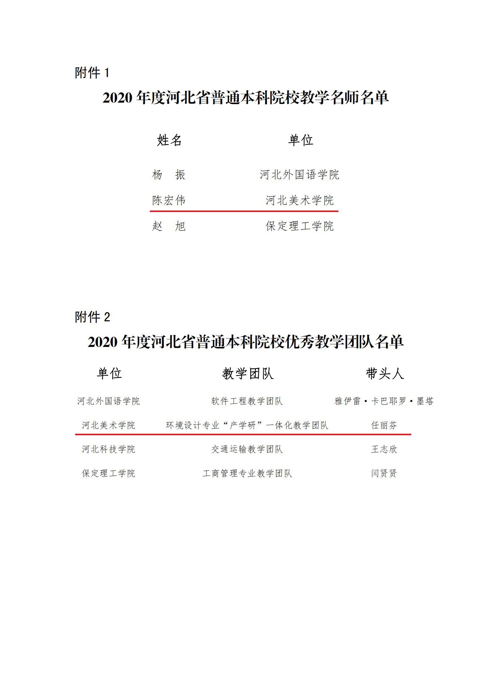 日前,河北省教育厅下发了《关于公布2020年度河北省普通本科院校教学名师和优秀教学团队名单的通知》(冀教高函〔2020〕63号),BEAT365国际教育学院陈宏伟教授获得省级教学名师奖,环境艺术学院任丽芬教授带领的“双创背景下环境设计专业‘产学研’一体化教学团队”获批2020年省级优秀教学团队。