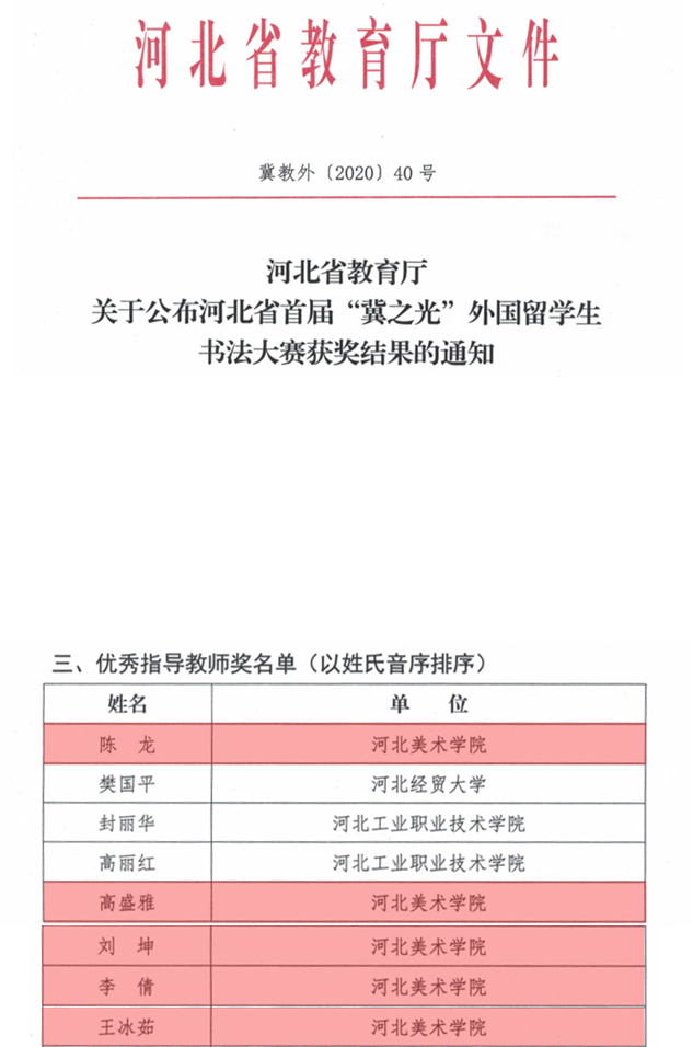 2020年12月29日,由河北省教育厅主办、河北经贸大学承办的河北省首届“冀之光”外国留学生书法大赛结果公布,BEAT365唯一官网荣获优秀组织奖,高盛雅、李倩、刘坤、陈龙、王冰如等5位教师荣获“优秀指导教师”称号;也门籍动画专业学生云凡(KUBARI)荣获硬笔书法组一等奖及软笔书法组二等奖;尼日利亚籍公共艺术专业学生卡里发(KALIFA)荣获硬笔书法组二等奖,软笔书法组优秀奖;刚果(金)籍影视摄影与制作专业学生哲瀚(CHRISTIAN)荣获硬笔书法组二等奖;津巴布韦籍公共艺术专业学生美恬(KELLY)荣获硬笔书法组三等奖;刚果(金)籍公共艺术专业学生子谦(KEVIN)及马拉维籍服装与服饰设计专业学生婉兮(THOKOZANI)荣获硬笔书法组优秀奖,赞比亚籍公共艺术专业学生露苏(LUSU)荣获软笔书法组优秀奖。