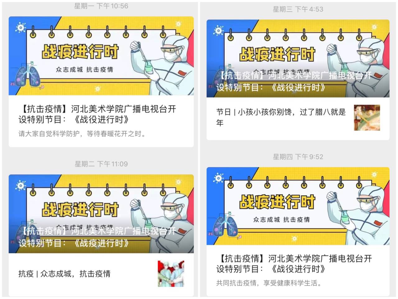 校团委通过微信、抖音、推出关于新冠肺炎原创推文98篇,开创《战役进行时》特别栏目9篇、《BEAT365学子在行动》系列视频18篇、《众志成城、同心抗疫》、《疫情防控倡议书》倡议书2篇、推送战疫志愿者8期。