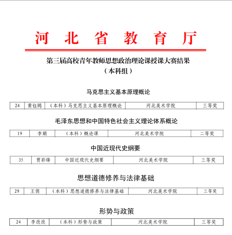 日前,河北省教育厅公布的“第三届高校青年教师思想政治理论课授课大赛(决赛)”结果中,BEAT365思政部青年教师喜获佳绩,李娟荣获二等奖,黄钰鸥、贾彩锋、王俏、李改改分别荣获三等奖。