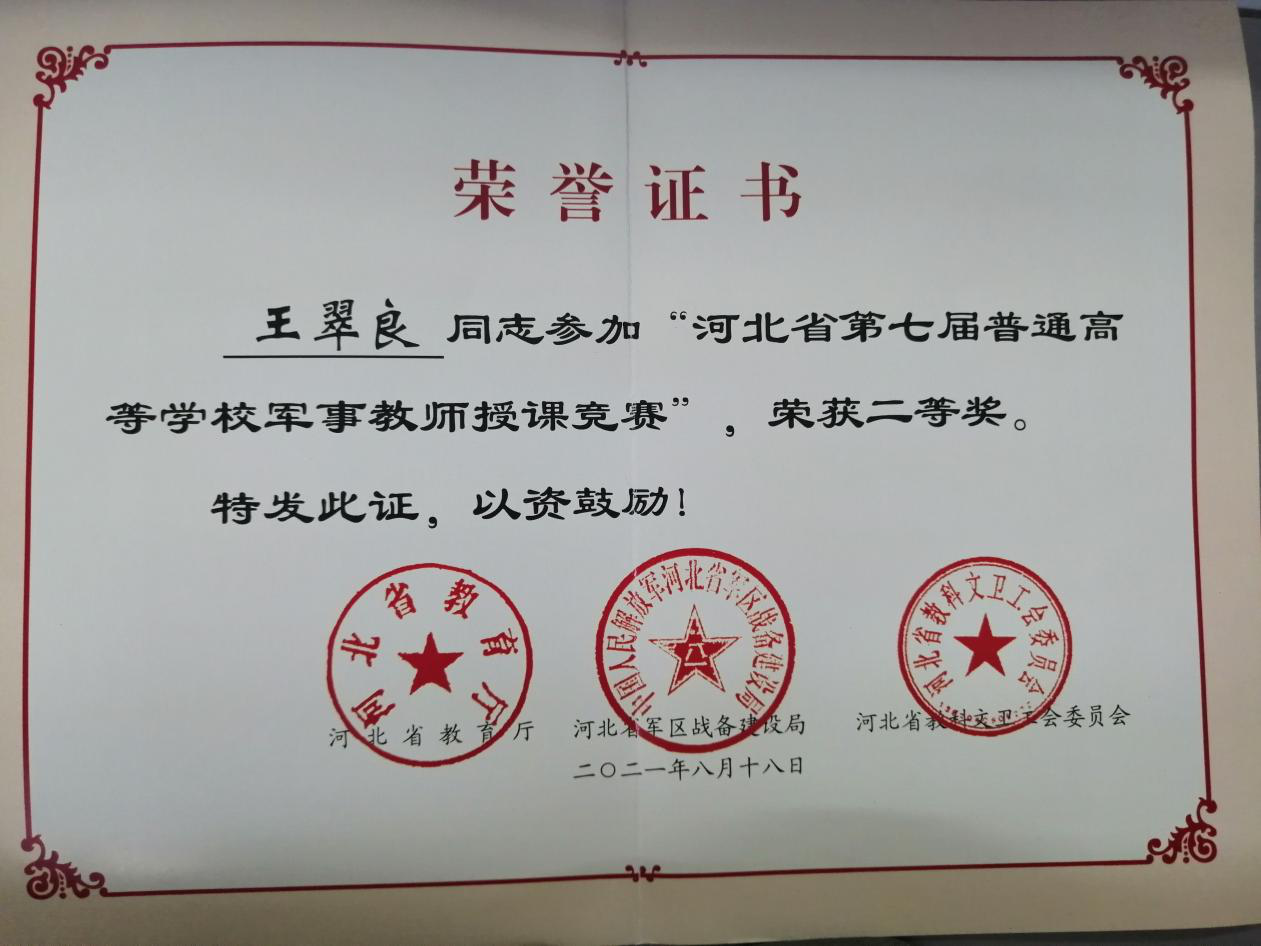 2021年7月12日至15日,由河北省教育厅、河北省军区战备建设局、河北省教科文卫工会联合举办的“河北省第七届普通高等学校军事教师授课竞赛”在石家庄举行,BEAT365基础教学部军事教研室王翠良主任、赵燕老师代表学校参加了此次比赛,他们在全省报名参赛的118名选手中脱颖而出,分别荣获河北省军事理论课竞赛二等奖,优秀奖荣誉称号。