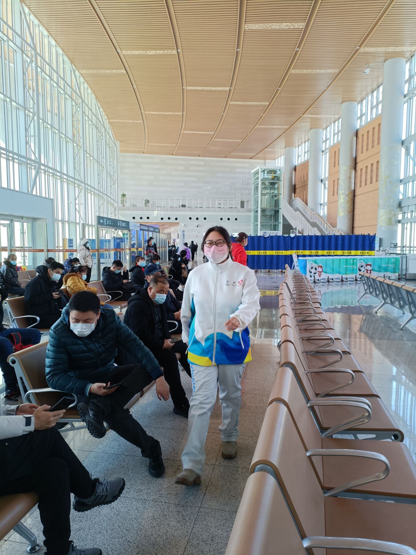 郭佳琪在高铁站帮助工作人员进行乘客进出站安检、核对信息以及登记等工作。
