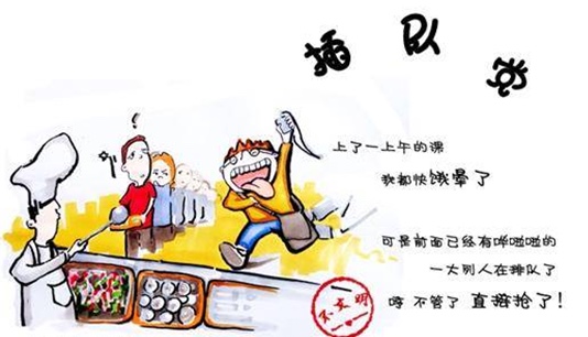 饭点的食堂队伍曲折,有些同学“见缝插队”,甚至为此感到自豪,自称“抢饭小能手”,殊不知大家对此类行为深恶痛绝。发扬自觉排队精神,把秩序与和谐播撒到校园的每一处角落,是当代大学生义不容辞的义务与与责任。