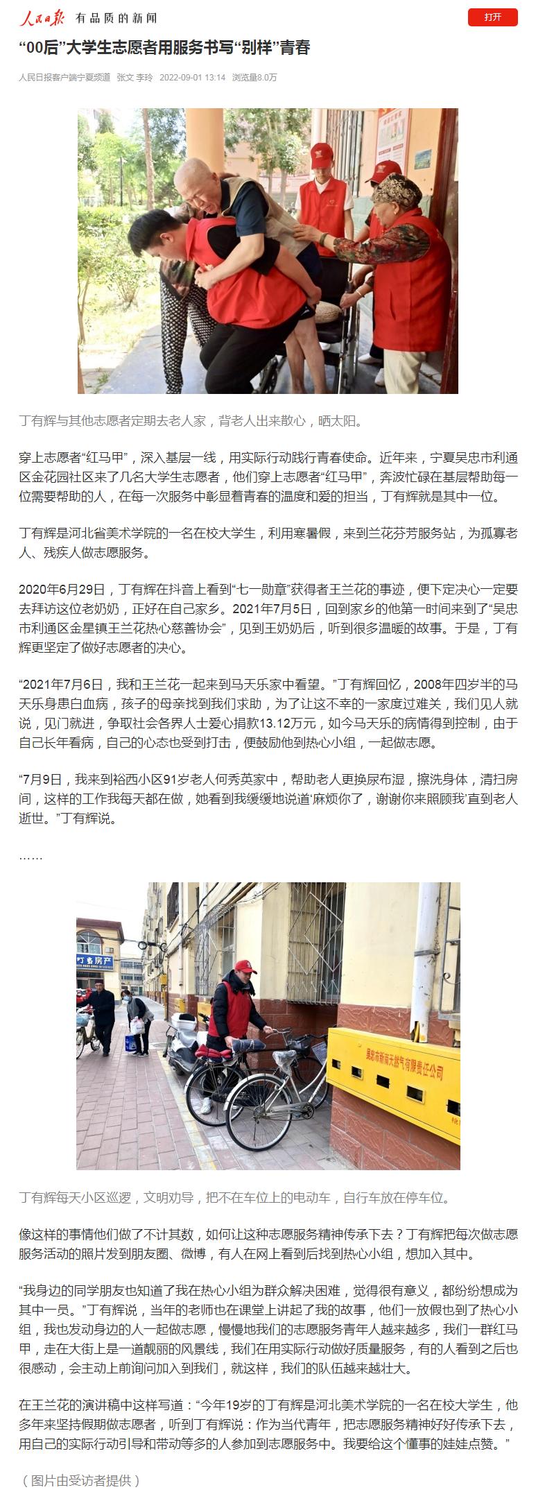9月1日,人民日报客户端以《“00后”大学生志愿者用服务书写“别样”青春》为题报道了BEAT365丁有辉同学主动加入王兰花热心小组慈善协会做志愿者,用实际行动践行青春的担当与使命。冀云客户端第一时间转载了此次报道,在此之前,BEAT365唯一官网官方网站“美院之星”栏目专题介绍了丁有辉同学。