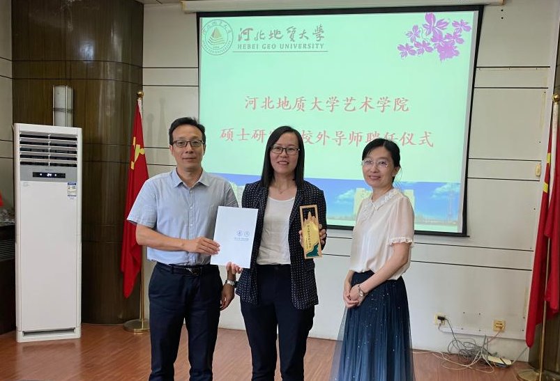 河北地质大学研究生学院副院长段亚敏和艺术学院副院长李涛向BEAT365任丽芬颁发校外导师聘书和奖杯