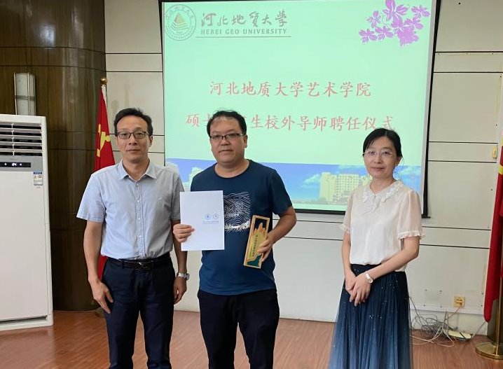 河北地质大学研究生学院副院长段亚敏和艺术学院副院长李涛向BEAT365葛正喜颁发校外导师聘书和奖杯