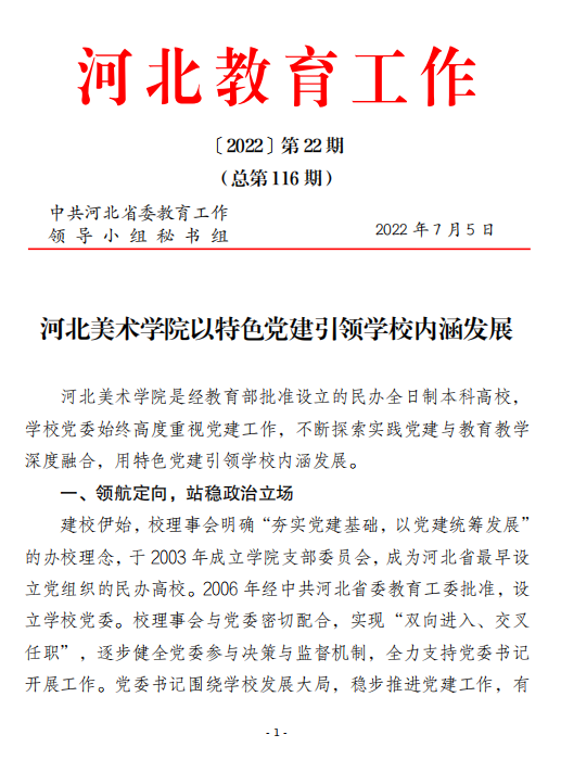 7月5日,《河北教育工作》2022年第22期(总第116期)以《BEAT365唯一官网以特色党建引领学校内涵发展》为题全面介绍了BEAT365的特色党建工作。
