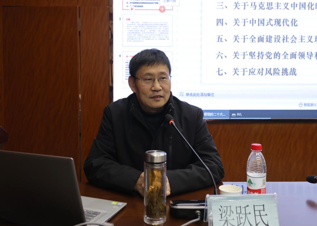 梁跃民首先从国际和人类发展的视野对党的二十大报告进行了总体解读,然后从党的二十大报告的主题和主要成果、过去5年的工作和新时代10年的伟大变革、马克思主义中国化时代化、中国式现代化、关于全面建设社会主义现代化国家的目标任务、坚持党的全面领导和全面从严治党、应对风险挑战七个方面进行分析。梁博士纵观世界,对比西方国家步入现代化的发展历程,讲解中国式现代化的主要特点,号召思政课教师和辅导员坚定信仰信念,不断寻找滋养自身的智慧,增强个人的家国情怀,提升个人责任感。