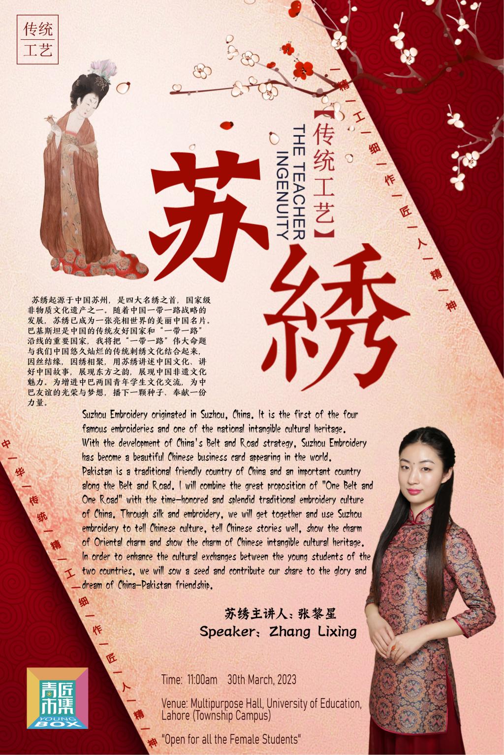 此次活动中,她用实际行动传播苏绣艺术,增进了中巴两国青年学生的文化交流,为中巴友谊的光荣与梦想,播下一颗种子,为推动中华优秀传统文化“走出去”,奉献了一份力量。