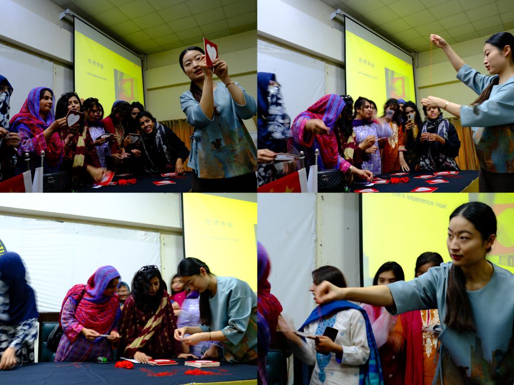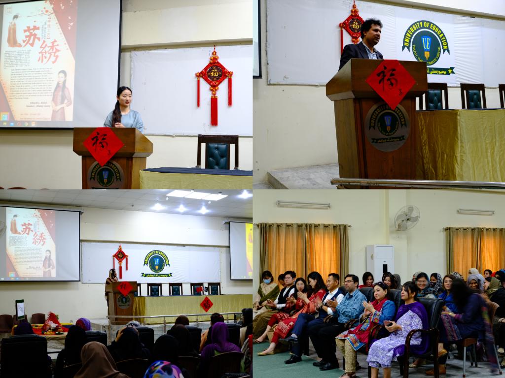 3月30日上午,中巴项目博士在读学生张黎星作为主讲人在巴基斯坦拉合尔教育大学多功能厅讲解苏绣文化,并带领与会人员现场体验了苏绣制作。