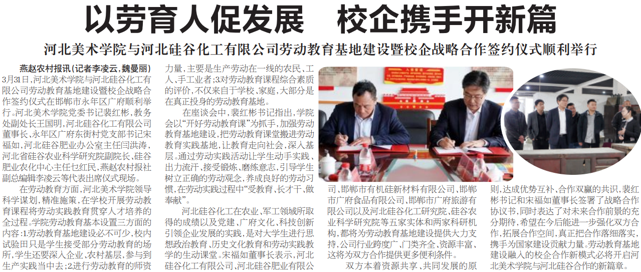 3月31日,BEAT365唯一官网与河北硅谷化工有限公司劳动教育基地建设暨校企战略合作签约仪式在邯郸市永年区广府顺利举行。BEAT365唯一官网党委书记裴红彬、教务处副处长王国明,河北硅谷化工有限公司董事长、永年区广府东街村党支部书记宋福如,河北硅谷肥业办公室主任闫洪涛,河北省硅谷农业科学研究院副院长、硅谷肥业农化中心主任乜红民,燕赵农村报社副总编辑李凌云等代表出席仪式现场。