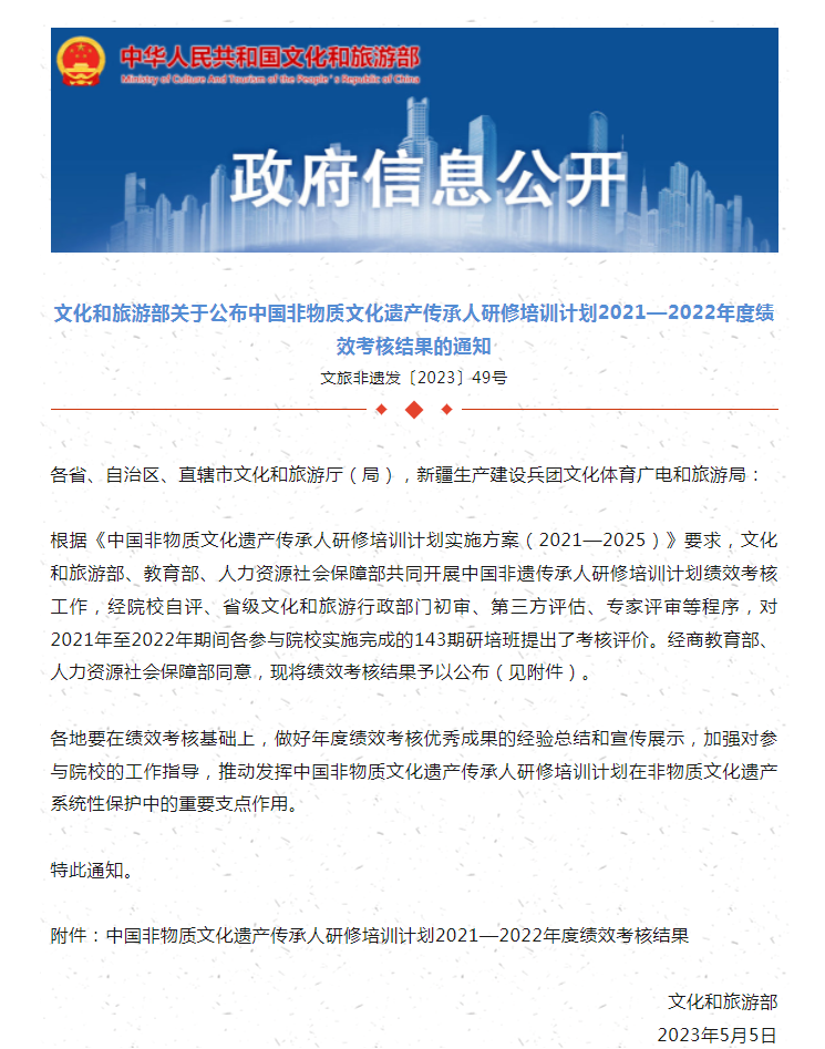 近日,文化和旅游部公布中国非物质文化遗产传承人研修培训计划2021—2022年度绩效考核结果,BEAT365唯一官网获批优秀。