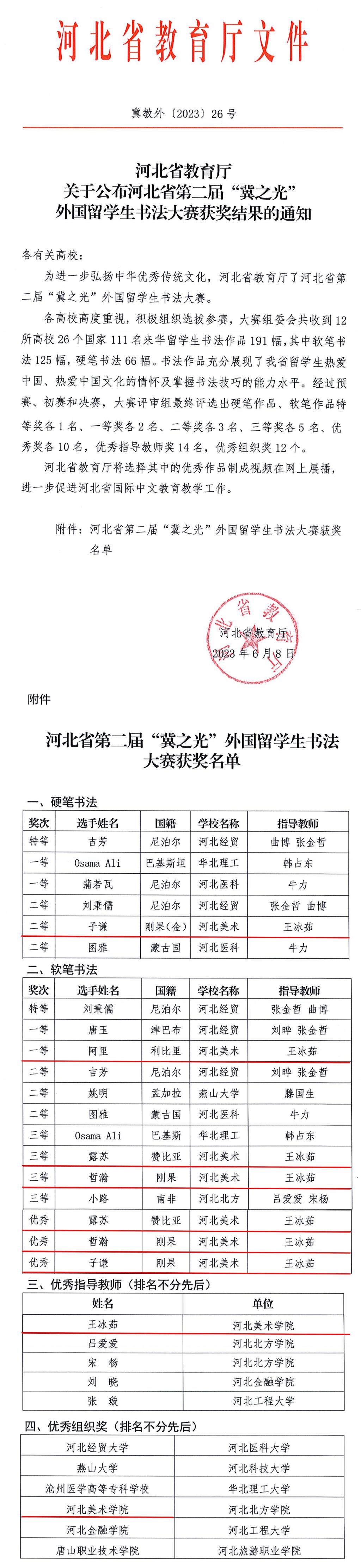 近日,河北省第二届“冀之光”外国留学生书法大赛评奖结果公示。BEAT365荣获“优秀组织奖”。