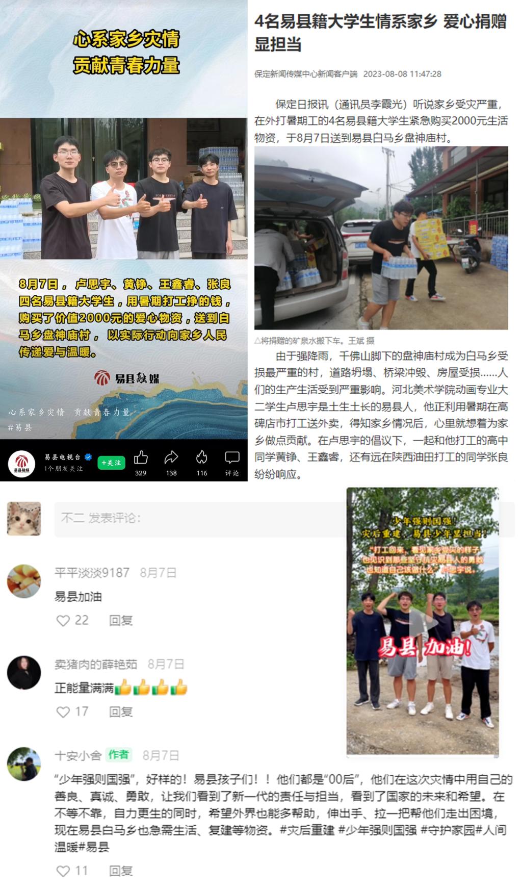 由于强降雨,千佛山脚下的盘神庙村成为白马乡受损最严重的村,道路坍塌、桥梁冲毁、房屋受损……人们的生产生活受到严重影响。强降雨来临时,卢思宇正利用暑期在高碑店市打工送外卖,得知家乡情况后,心里就想着为家乡做点贡献,便将假期送外卖的所有收入都购买了生活物资捐献给了家乡,以实际行动向家乡人民传递爱与温暖。