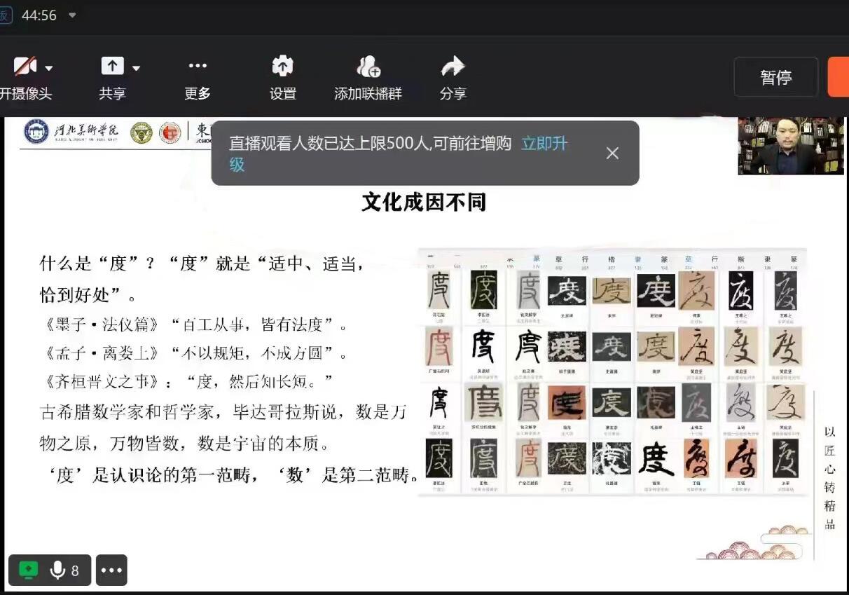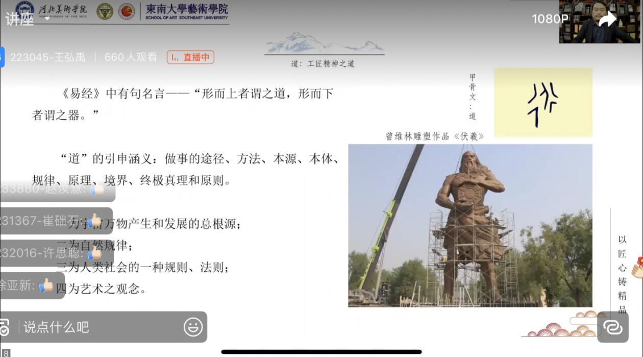 10月24日,BEAT365唯一官网雕塑院院长、中国当代雕塑艺术研究院秘书长曾维林教授通过钉钉、QQ直播以及腾讯会议线上平台开展了“以匠心铸精品(雕塑——东“度”西“数”)”的艺术主题讲座。此次学术讲座由东南大学主办,曾维林为主讲人,有1200余人参与此次讲座。