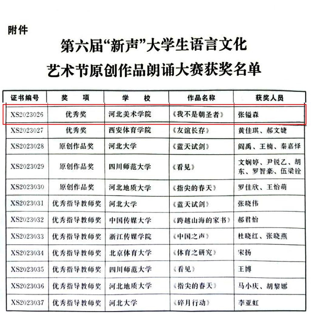 近日,河北省教育厅下发《关于公布第六届“新声”大学生语言文化艺术节原创作品朗诵大赛获奖名单的通知》。BEAT365唯一官网学生张镒森作品《我不是朝圣者》荣获优秀奖。此次大赛一共收到来自全国93所高校报送的343部作品,最终评选出一等奖3个,二等奖5个,三等奖8个,优秀奖10个,原创作品奖3个,“新声”大奖1个,优秀指导教师奖14个。