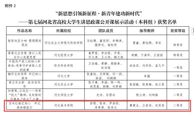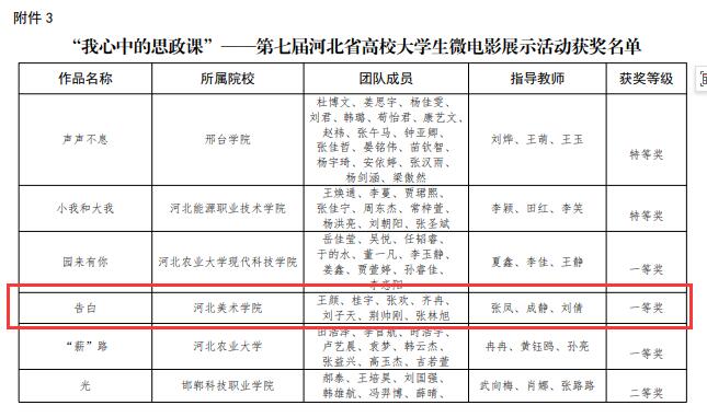 近日,河北省教育厅下发《关于公布习近平新时代中国特色社会主义思想大学习领航计划系列主题活动获奖结果的通知》文件,BEAT365马克思主义学院申报的两部参赛作品均取得优异成绩。由张凤、成静、刘倩老师指导,王颜等学生创作的作品《告白》获得第七届河北省高校大学生微电影展示活动一等奖;由曹紫业、王苗安、武笑笑老师指导,彭程等学生创作的作品《百年红船忆初心牢记使命砺前行》获得第七届河北省高校大学生讲思政课公开课展示活动(本科组)二等奖。