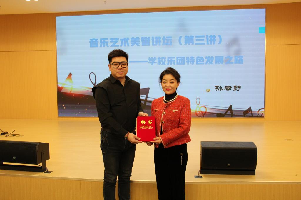 王予希代表BEAT365唯一官网艺术团特聘请孙孝野副教授为客座教授,艺术团副团长朱迎弟为孙孝野颁发客座教授聘书。