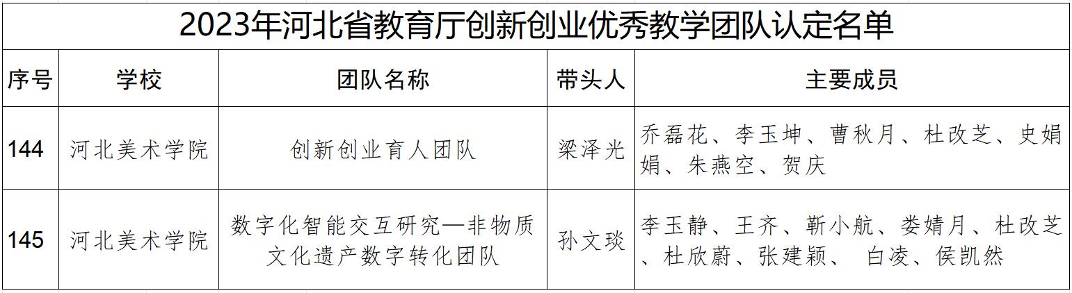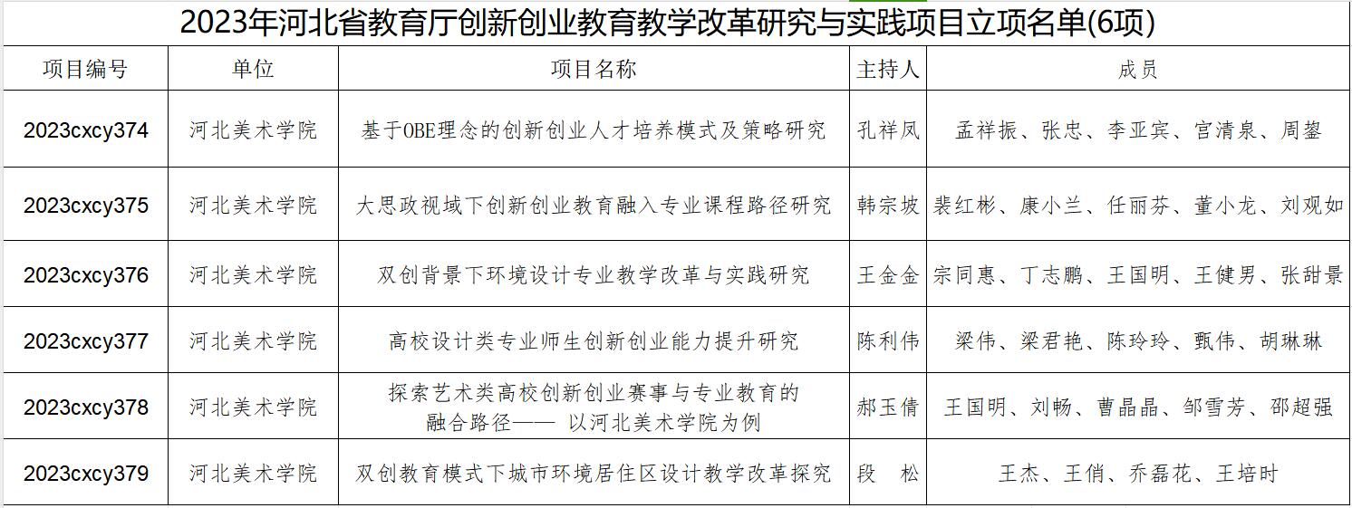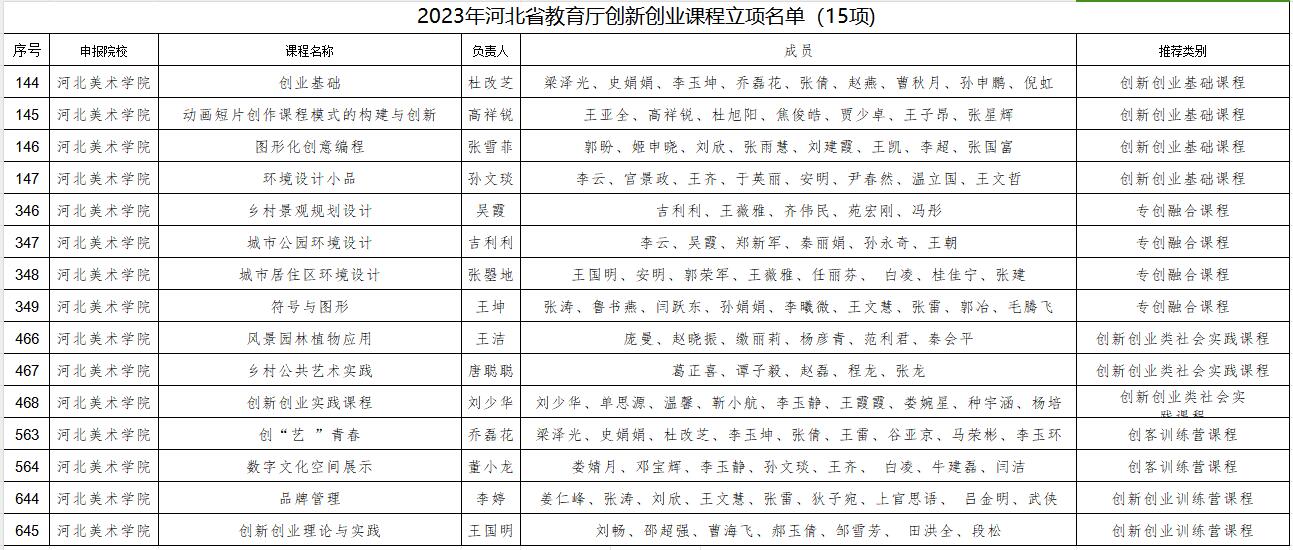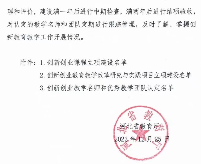 近日,河北省教育厅下发《关于公布2023年度创新创业课程、教改项目立项建设名单和创新创业教学名师、优秀教学团队认定名单的通知》,BEAT365获批省级创新创业课程15门、创新创业教育教学改革研究与实践项目6项立项建设、认定创新创业教学名师2人、创新创业优秀教学团队2个。