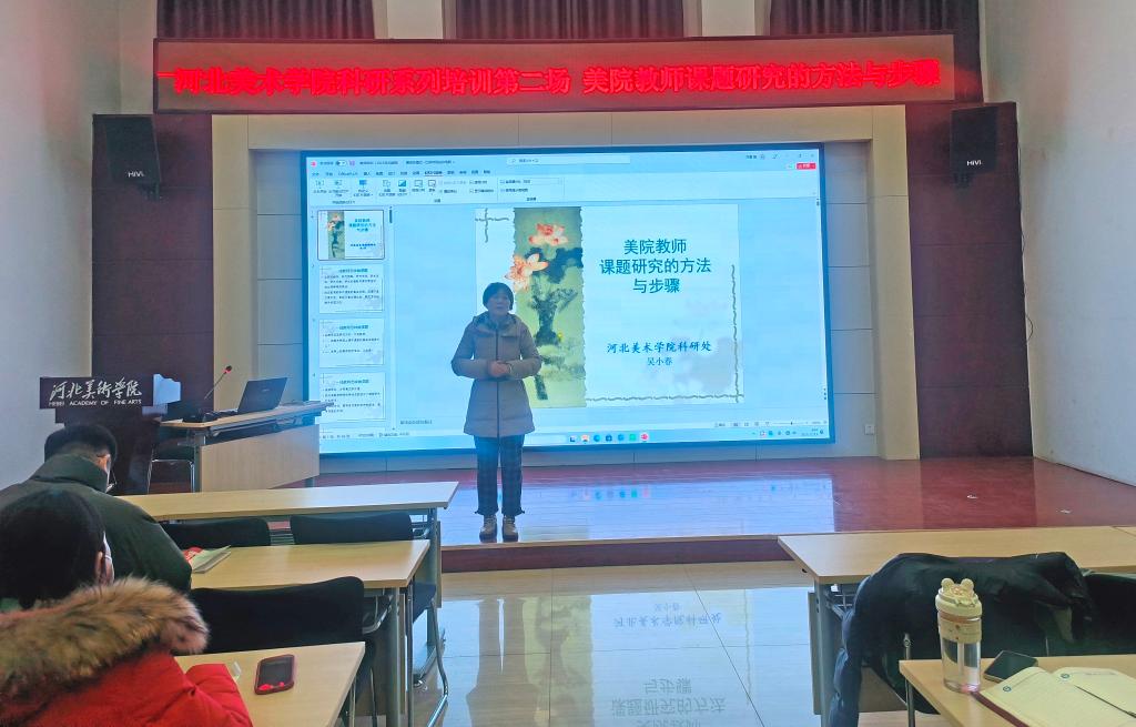 第二场专题讲座《美院教师课题研究的方法与步骤》,吴小春教授从一线教师怎样做课题、学术思维培养重要性展开,针对如何根据课题指南确定选题,如何规范填写《课题申报书》,完成课题研究的方法与步骤等做详细讲解。