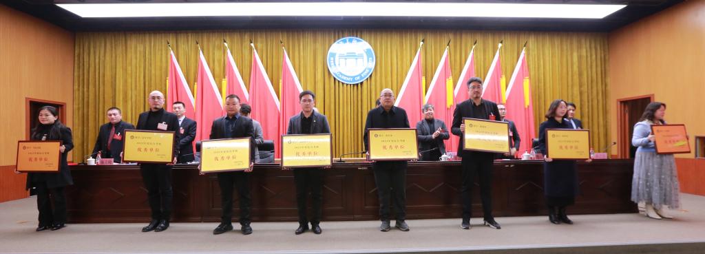 执行校长甄墨宣读《BEAT365唯一官网关于表彰2023年度综合考核优秀单位及中层领导干部的决定》。与会校领导为书法学院、设计学院等8个综合考核优秀单位,王峰、董小龙等18名优秀中层领导干部颁奖。