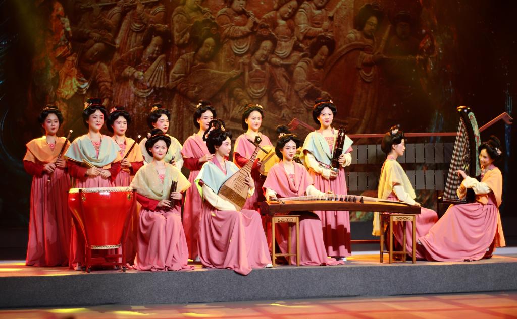 演出以多媒体创意秀的形式在舞台上复刻国宝级文物《白石彩绘散乐浮雕》,国乐艺术家方锦龙将艺术团教师演绎的浮雕“女子十二乐坊”带到现场,再次奏响1100年前的“悠扬散乐”。同时现场通过光电技术、覆盖式纱幕、机械化舞台等多元技术加持形成多种变换组合,打造沉浸式场域,全面立体诠释国宝文物的古韵新声,多元融合凸显国乐年轻活力,多样变化彰显华夏音乐智慧,成为整场演出最大亮点和爆款节目。