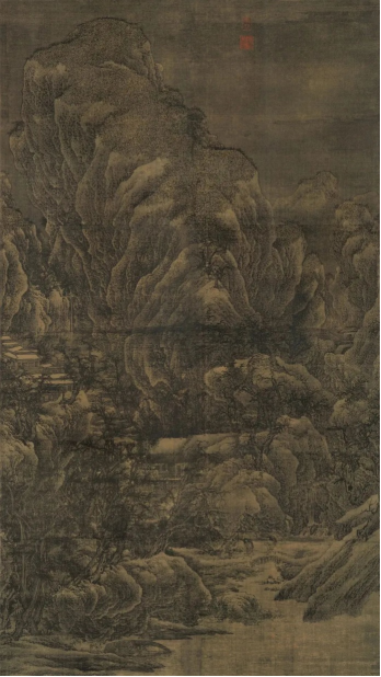 《雪山楼阁图》是北宋画家范宽的作品,通体采用全景式“高远”构图,描绘了主峰巍然屹立、披素戴雪,周遭群峰拱卫的景致。其间点缀木桥、殿宇等不同等级和功能的建筑。画面左下角有渔夫正卖鱼于顾客,山间小路上的行人冒匆匆赶路,形态生动,比例自然。而全图最光亮夺目之处就在于楼阁屋顶上的落雪,为本作的点睛之笔,是一幅非常优秀的宋代精品。