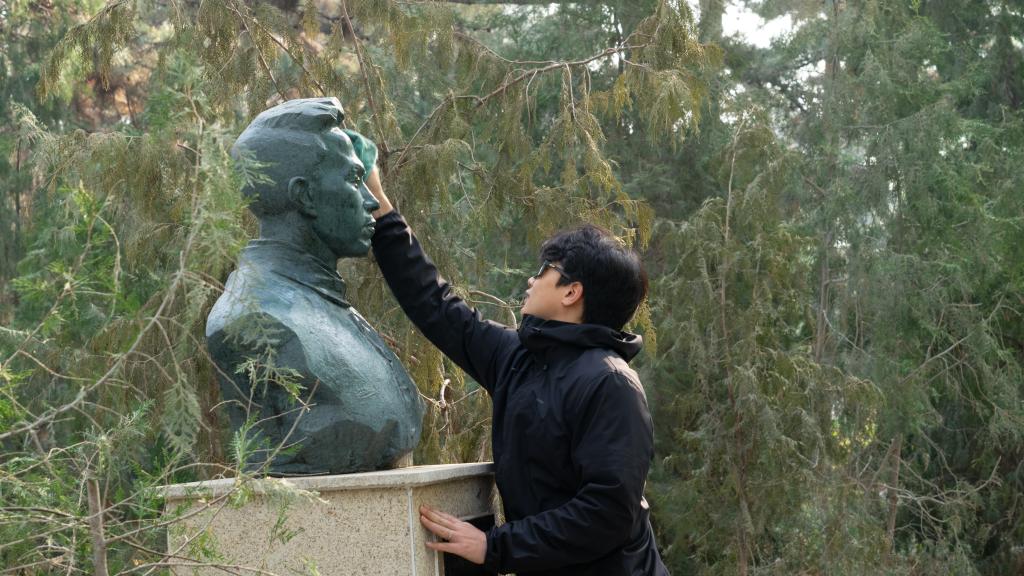 仪式结束后,学生们自发对红色文化情景园内的烈士塑像进行清扫并献花。