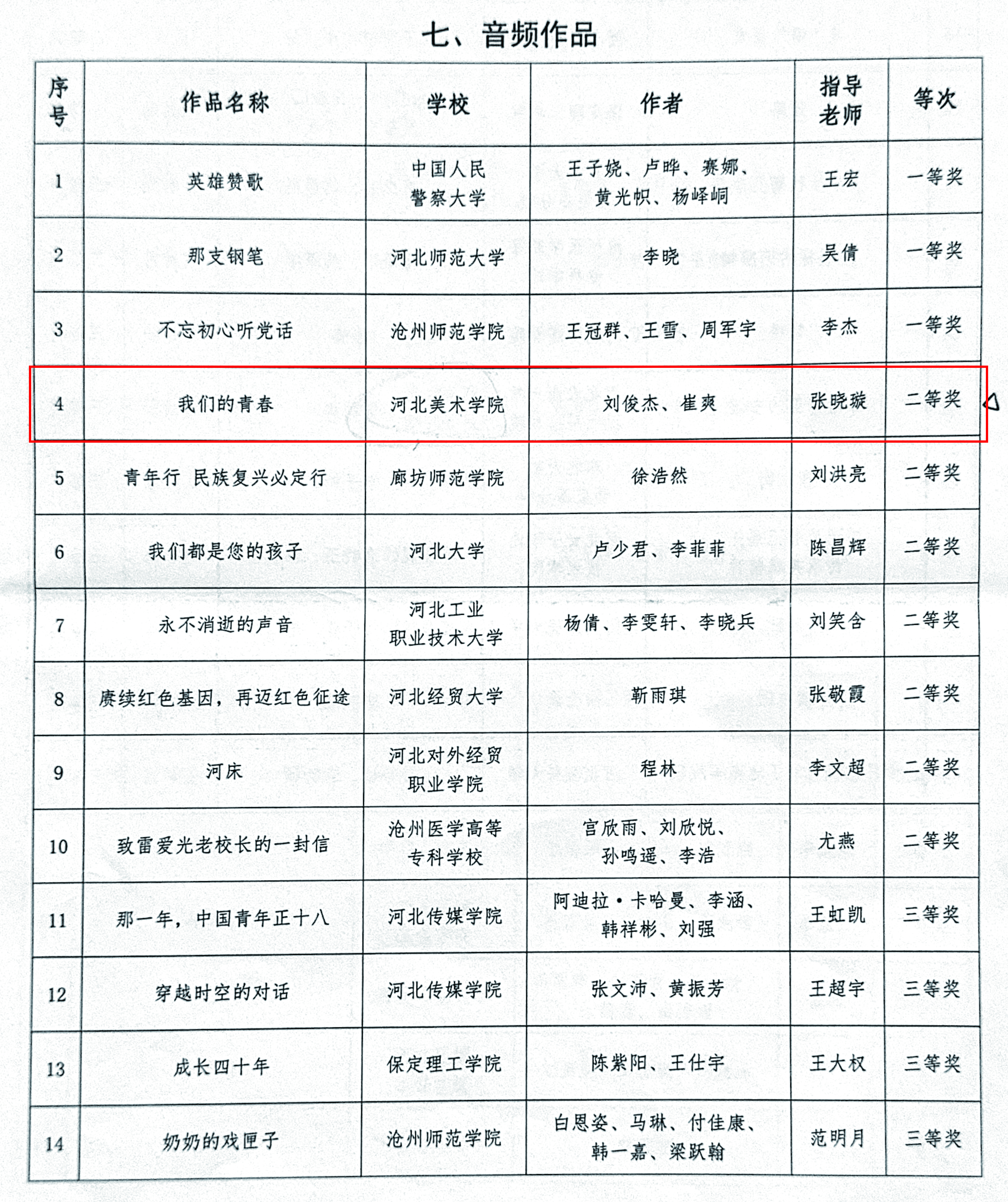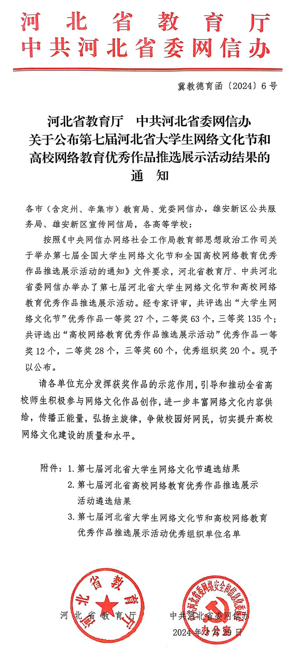 近日,河北省教育厅、中共河北省委网信办公布了第七届河北省大学生网络文化节和高校网络教育优秀作品推选展示活动遴选结果,BEAT365共有2件作品获奖。其中,赵岩老师指导、学生徐川淼撰写的《吾与吾辈荐轩辕》获网络文章类三等奖;张晓璇老师指导,学生刘俊杰、崔爽制作的《我们的青春》获音频作品类二等奖。
