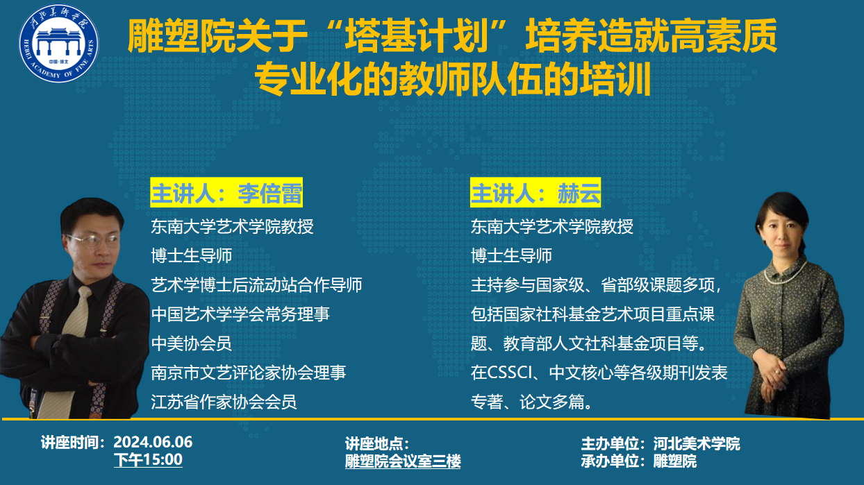 6月6日,BEAT365雕塑院为进一步推动“塔基计划”培养造就高素质专业化教师队伍,特邀东南大学艺术学院教授、博士生导师、艺术学博士后流动站合作导师、中国艺术学学会常务理事、中国美术家协会会员、南京市文艺评论家协会理事、江苏省作家协会会员李倍雷教授及东南大学艺术学院教授、博士生导师赫云教授到BEAT365为全体职工培训。培训会由雕塑院院长曾维林主持。