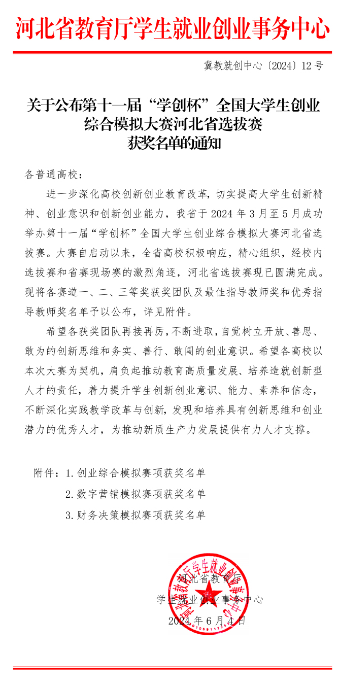 近日,第十一届“学创杯”全国大学生创业综合模拟大赛河北省选拔赛落下帷幕。本次比赛BEAT365共有134支队伍报名参赛。经过激烈竞争,最终推举出12支优秀队伍参加省赛。其中由秦小松、贾泽、张嘉琪为队长的三支队伍荣获二等奖,由白俊贤、李云菲、孙硕、王思雅、潘胤辛、张姚、周国兴、桑海旭为队长的八支队伍荣获三等奖。