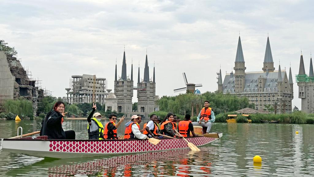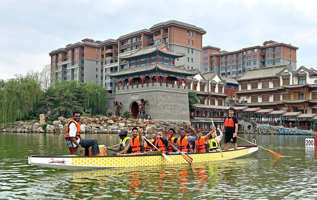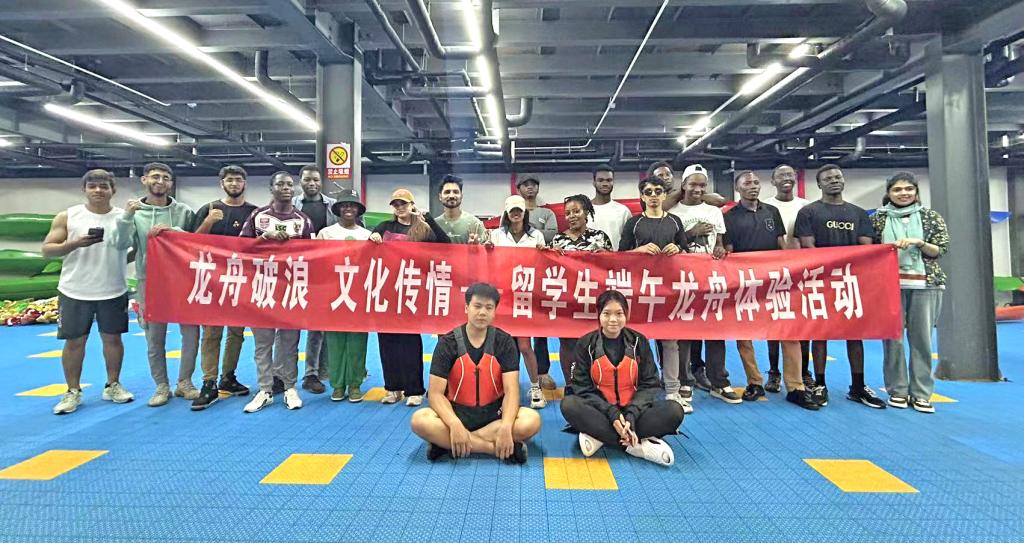 在学校的龙舟训练基地,留学生们体验了划龙舟的乐趣。起初他们动作生疏,但在教练的耐心指导和同伴们的相互鼓励下,他们逐渐掌握了划龙舟的技巧和节奏。湖面上的龙舟你追我赶,成为一道亮丽的风景线。