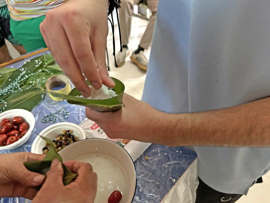 在专业老师的指导下,留学生们动手体验包粽子的过程。虽然手法略显生疏,但他们的热情和专注让人感动。