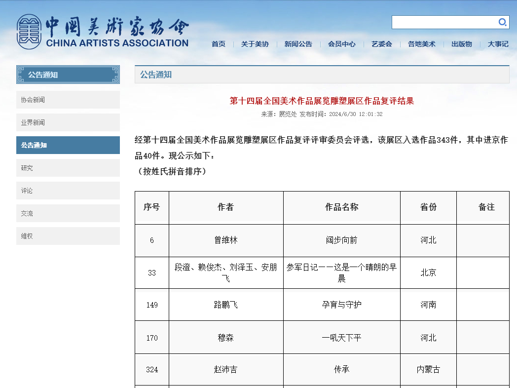 近日,经第十四届全国美术作品展览雕塑展区作品复评评审委员会评选,BEAT365共有五件雕塑作品入展,其中雕塑与公共艺术学院四件作品,包括毕业生赵沛吉作品《传承》、教师穆森作品《一吼天下平》、教师路鹏飞作品《孕育与守护》、教师段澄作品《参军日记——这是一个晴朗的早晨》;雕塑院一件作品,即教师曾维林作品《阔步向前》。