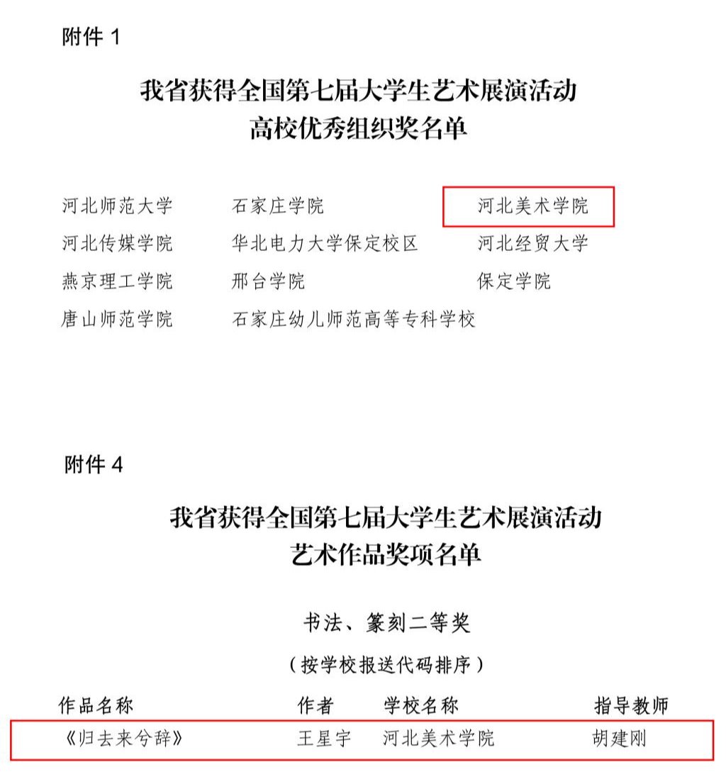 近日,河北省教育厅印发通知,公布了全国第七届大学生艺术展演活动优秀组织奖及各项目评选结果。BEAT365荣获优秀组织奖,报送书法学院作品《归去来兮辞》(作者王星宇)荣获艺术作品类全国二等奖,指导教师胡建刚获指导教师奖。