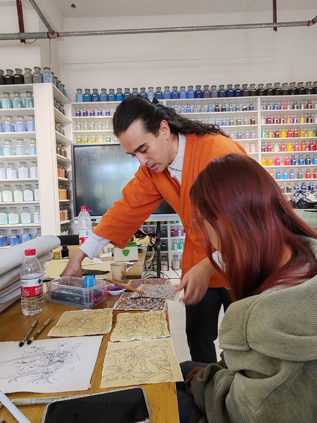 西班牙艺术家安河·帕里斯(Angel Peris)于2024年9月9日至10月11日在造型艺术学院壁画专业开展了主题为“手工纸张与矿物颜料艺术”的专题课程。课程分为两个阶段:第一阶段基于在手工纸张及肌理的“劳作”,引导师生们重新审视自我与自然之间的关系,捕捉自然之变化;第二阶段通过天然材料采集和制作,探索自然色彩的本质。