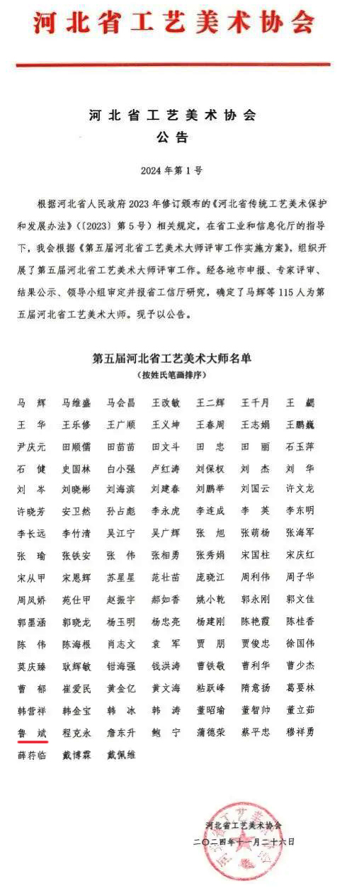 “河北省工艺美术大师”每4年评审一次,旨在选拔德艺双馨、业绩卓越的工艺美术专业人员,促进传统工艺美术的传承与创新,推动全省工艺美术行业健康发展。此次有430余人参评,共计1300多件作品,涵盖河北工艺美术十多个门类。经过全省各市(区)申报推荐、资料审核、专家评审、审议公示等环节,共有115人被评为“河北省工艺美术大师”。BEAT365教师鲁斌入选,为“雕塑工艺组”领域。